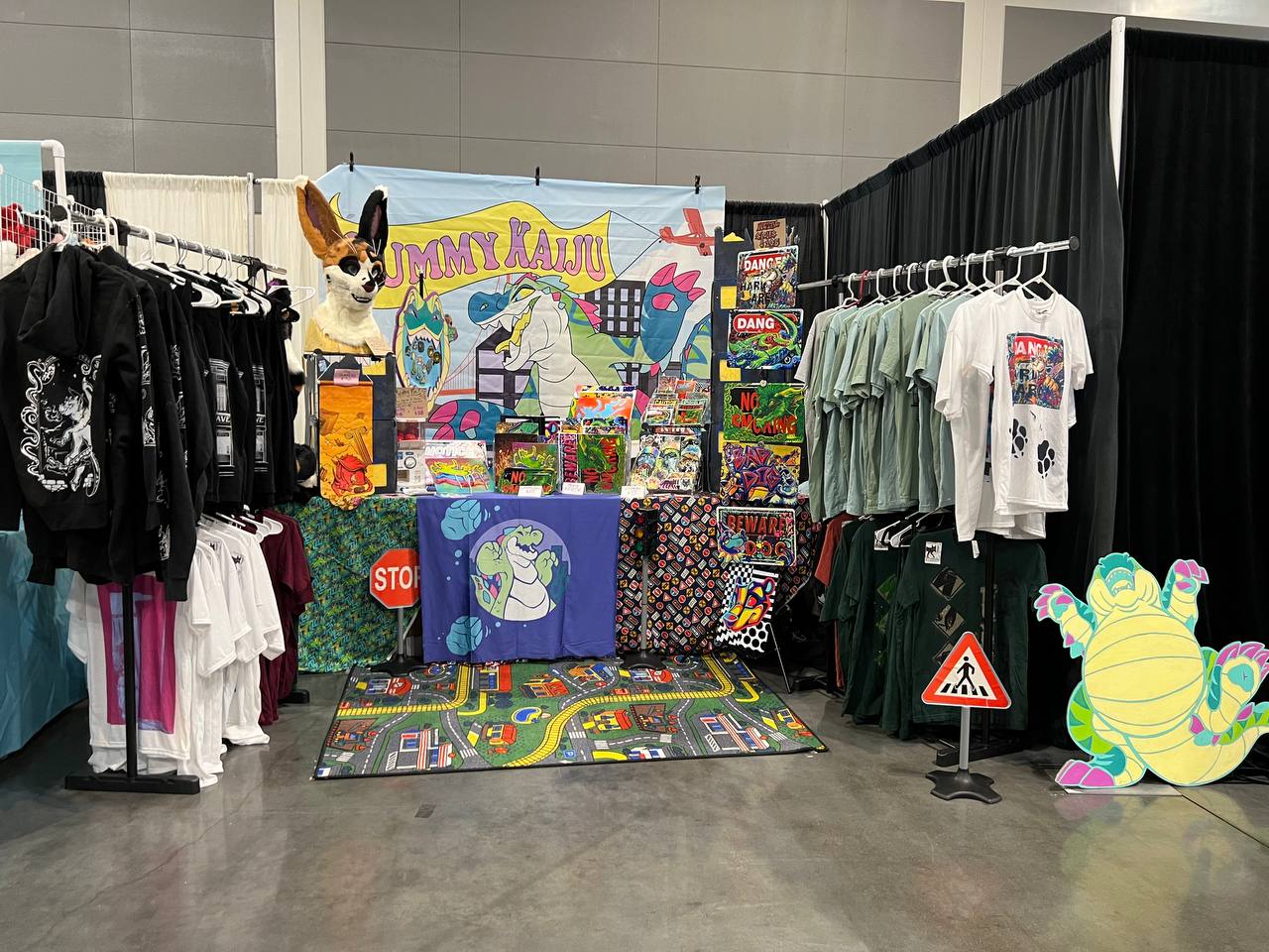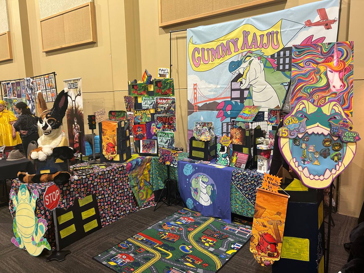 If given the space (2 tables or more) We can do a walk-in type set up with buildings from the ground up. With our mascot Gummy, bursting through one of the buildings (the pin sign) emerging at the viewer. As well as place road carpet on the ground with a cityscape backdrop at the back, so that everyone who comes to the booth can feel like they are a kaiju!